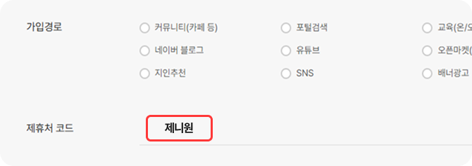 제휴처 코드에 [제니원]을 입력